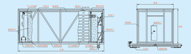 • 用于存储制冰机生产的冰。当用冰点在短时间内需要大量用冰的情况下,储冰库可以自动地输送冰,以满足用冰需求。储冰运转过程中,耙冰机构将制冰机制下来的冰在冰库水平范围内耙平,达到冰库存储的上限后,控制系统自动停止制冰机的运行。当冰库内的冰位较低时,又将自动启动制冰机。